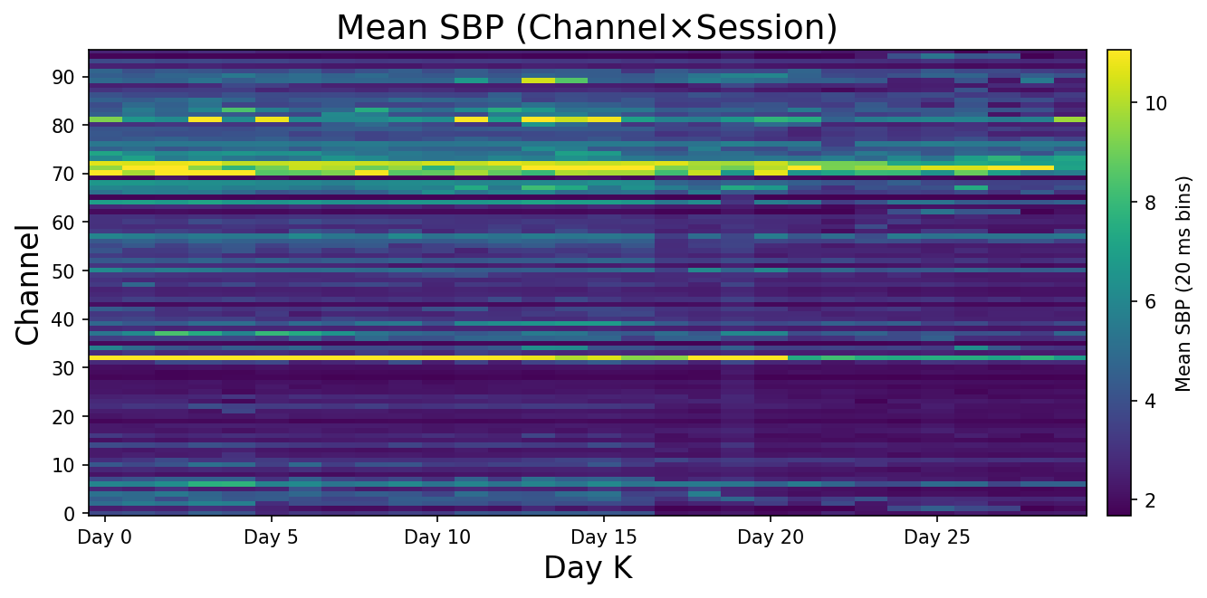 The most direct thing I can show you is a channel × session heatmap — mean SBP for every channel, every session, all at once. Each column is a session, each row is a channel.