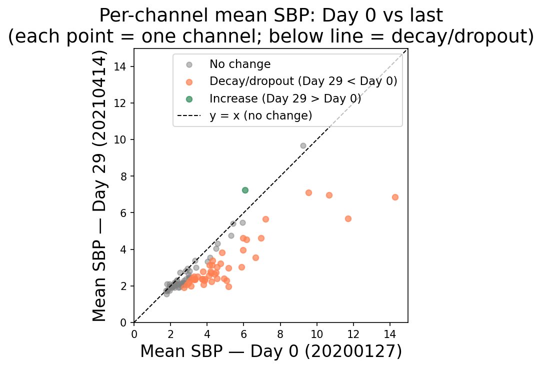I plotted per-channel mean SBP on day 0 against the same values on the last session. Points on the identity line mean no drift. Points off it mean the channel moved.